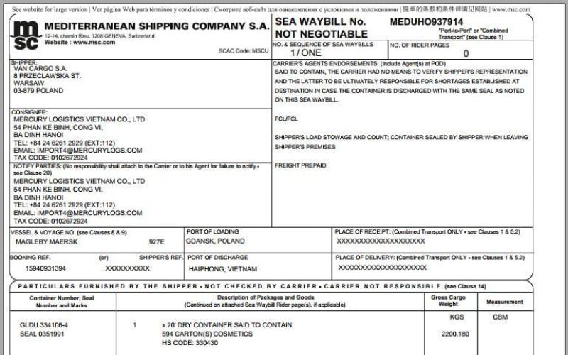 Seaway Bill là vận đơn không chuyển nhượng, không phát hành bản gốc ngay từ đầu. Khi hàng đến cảng, hãng tàu sẽ tự động giao hàng cho consignee được ghi trên vận đơn.