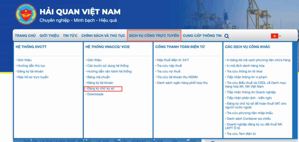 Vào hệ thống VNACCS/VCIS và chọn Đăng ký chữ ký số