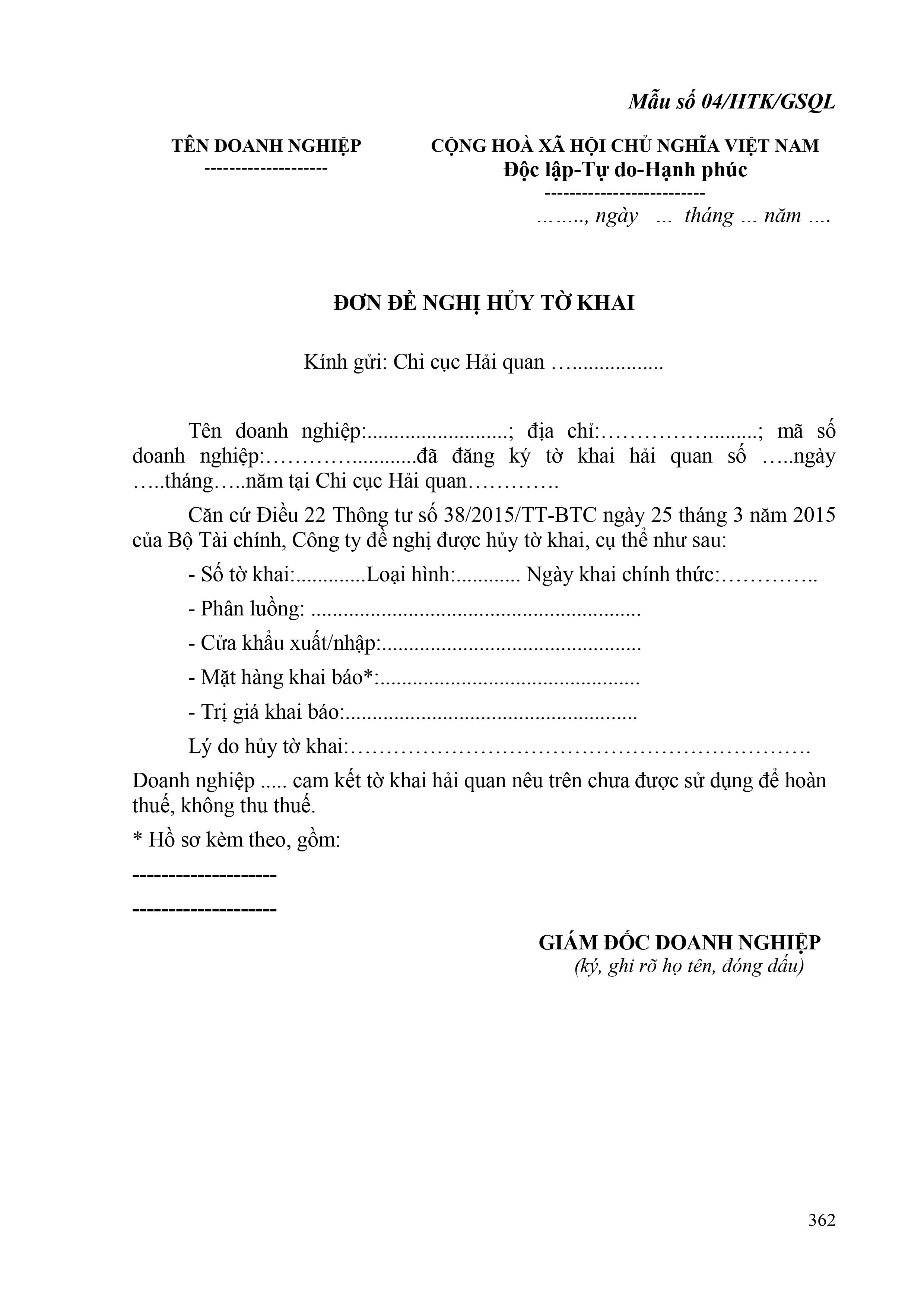 – Mẫu số Mẫu số 04/HTK/GSQL – Đơn đề nghị huỷ tờ khai (phụ lục V ban hành kèm theo Thông tư số 39/2018/TT-BTC)
