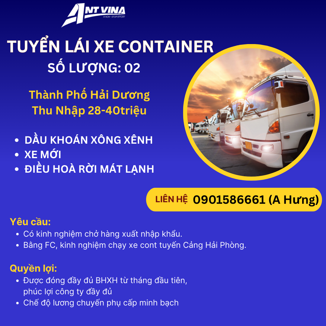 ANT Vina Logistics tuyển lái xe container chạy tuyến Hải Dương – Hải Phòng. Thu nhập 28–40 triệu/tháng, đóng BHXH đầy đủ, công việc ổn định, lâu dài.