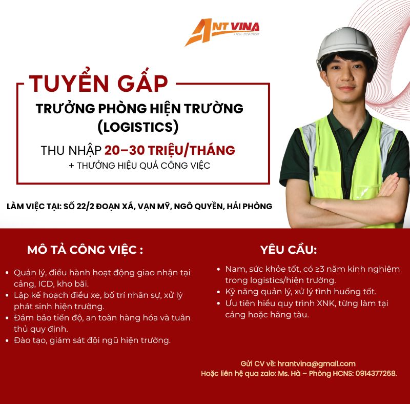 Nhằm đáp ứng nhu cầu mở rộng hoạt động tại Hải Phòng, Ant Vina hiện đang tuyển gấp vị trí Trưởng phòng Hiện trường (Logistics) – người có kinh nghiệm điều hành giao nhận hàng tại cảng, ICD và kho bãi.